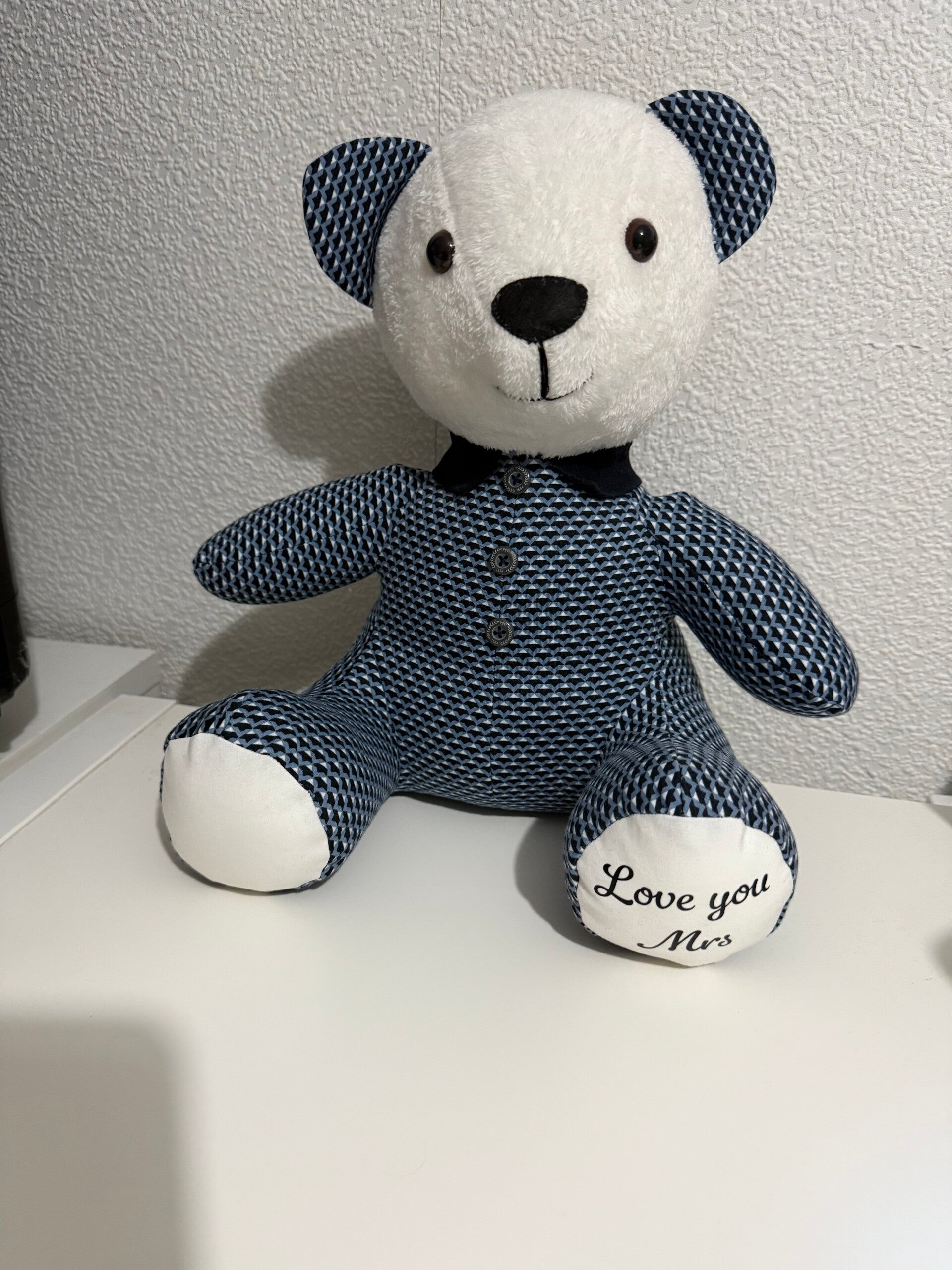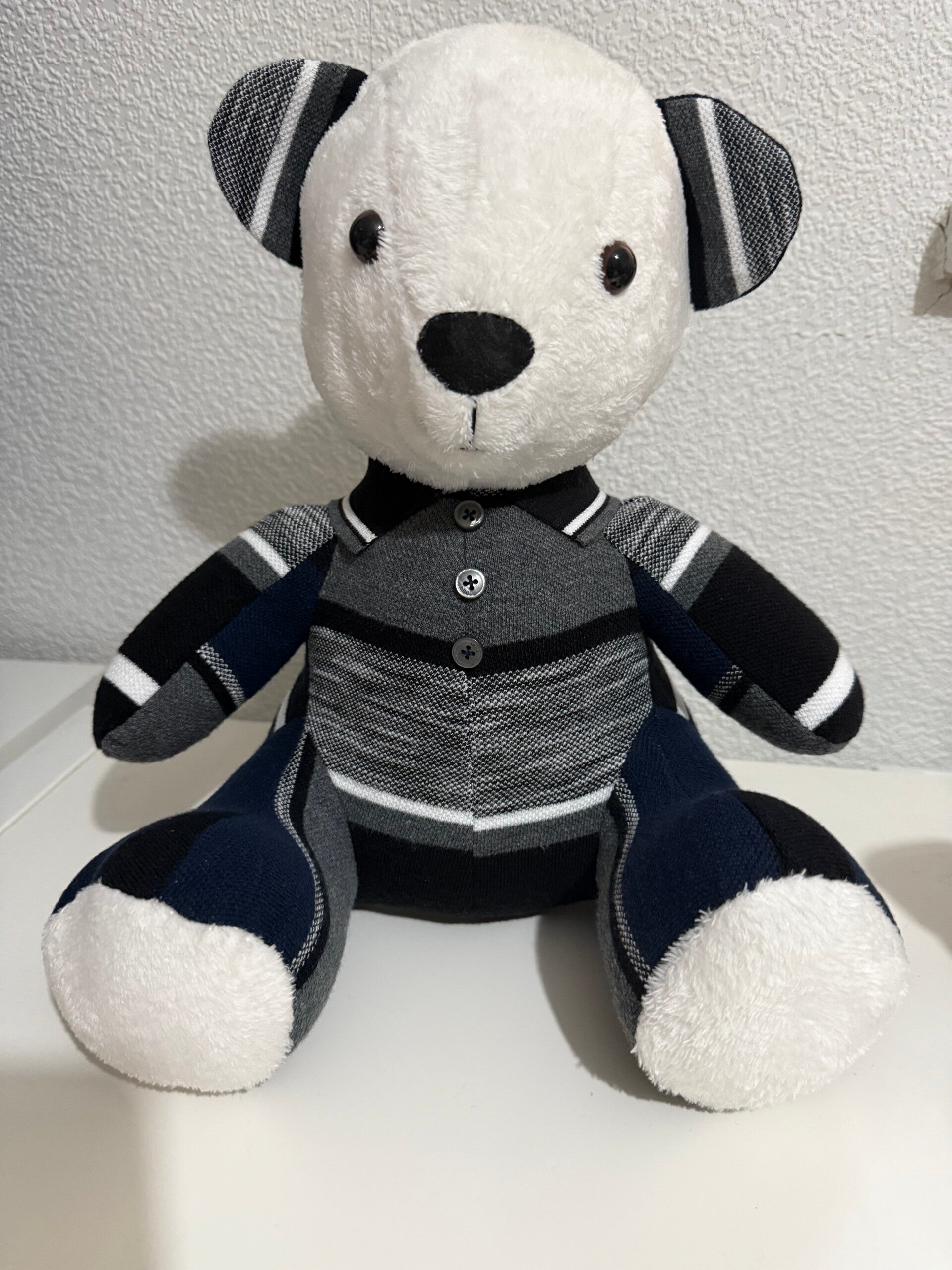 A soft, loving companion made from your treasured fabrics. This 12-inch seated bear sits upright, ready to hug, comfort, and preserve your most special memories.