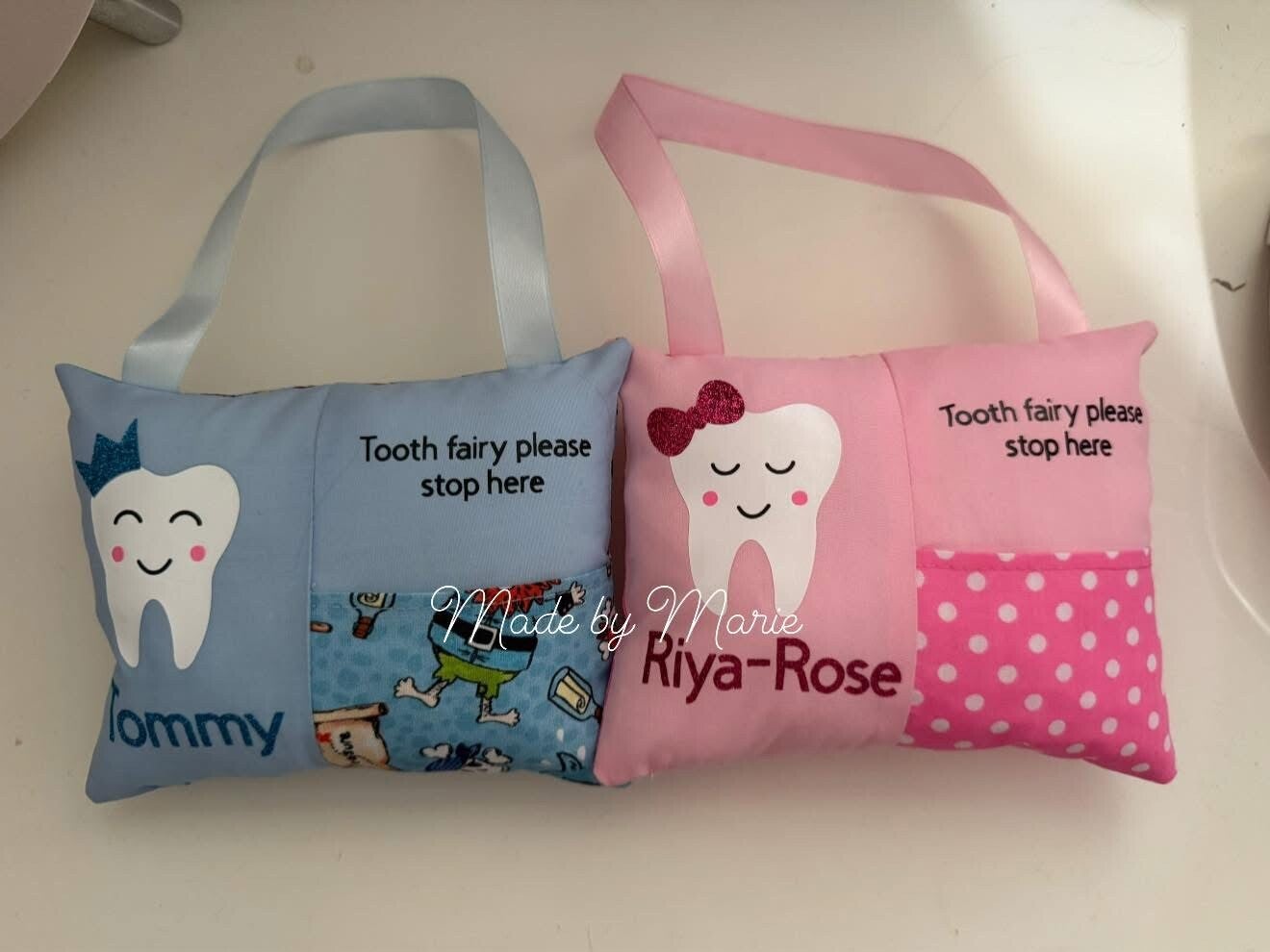Make losing a tooth a magical and personal experience with this adorable little cushion. Handmade with love , it features a single pocket on the front for your little one to place their tooth for the tooth fairy to collect , in return the tooth fairy an place a little surprise in the pocket . This cushion can be personalised with any name (I do this using vinyl lettering) . This makes it truly unique , the pillow is hung up using ribbon that is attached