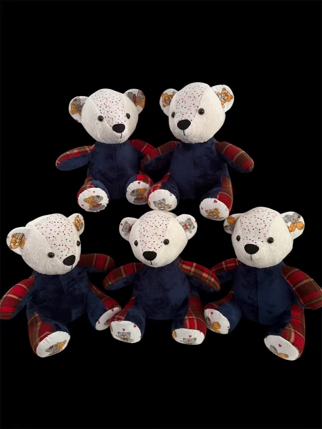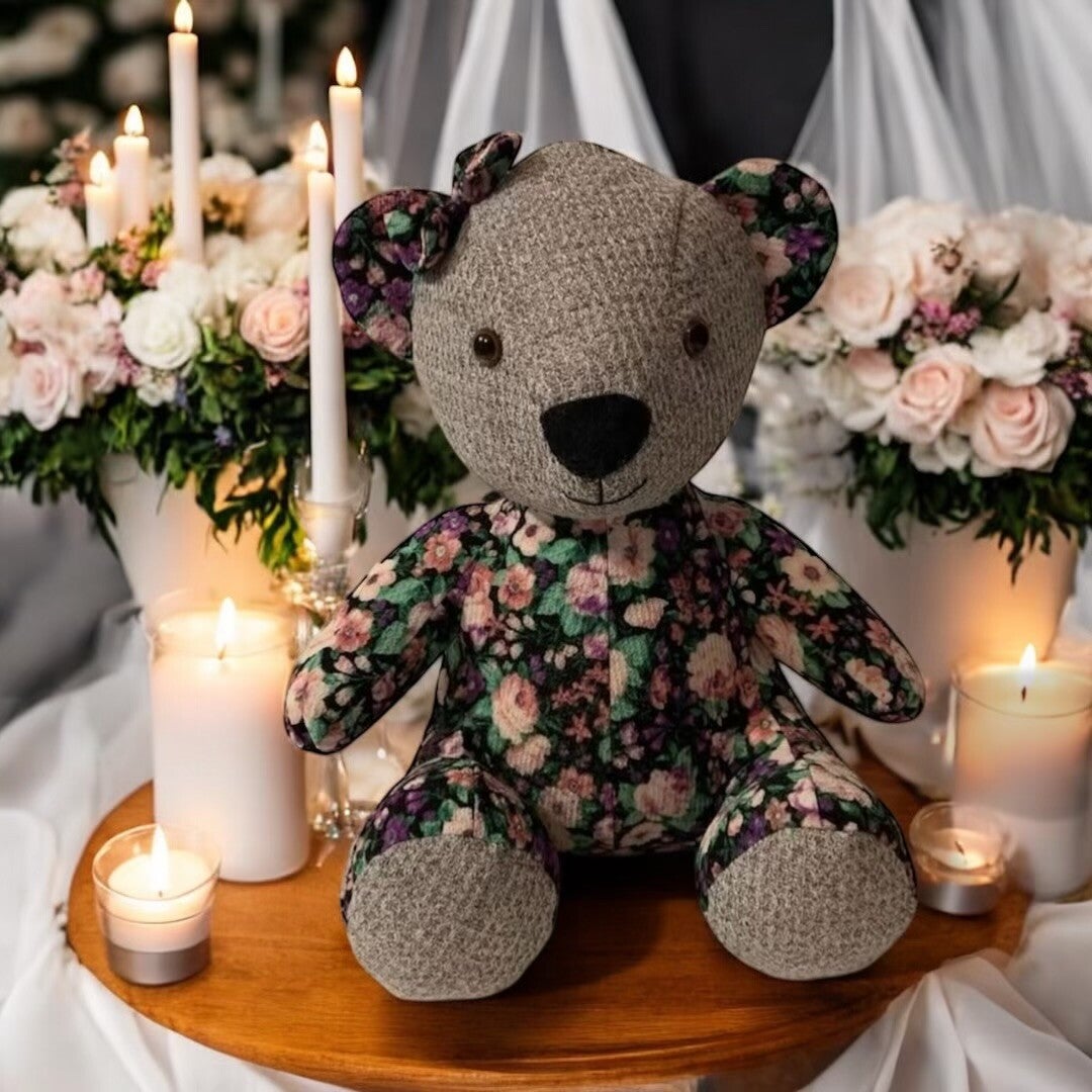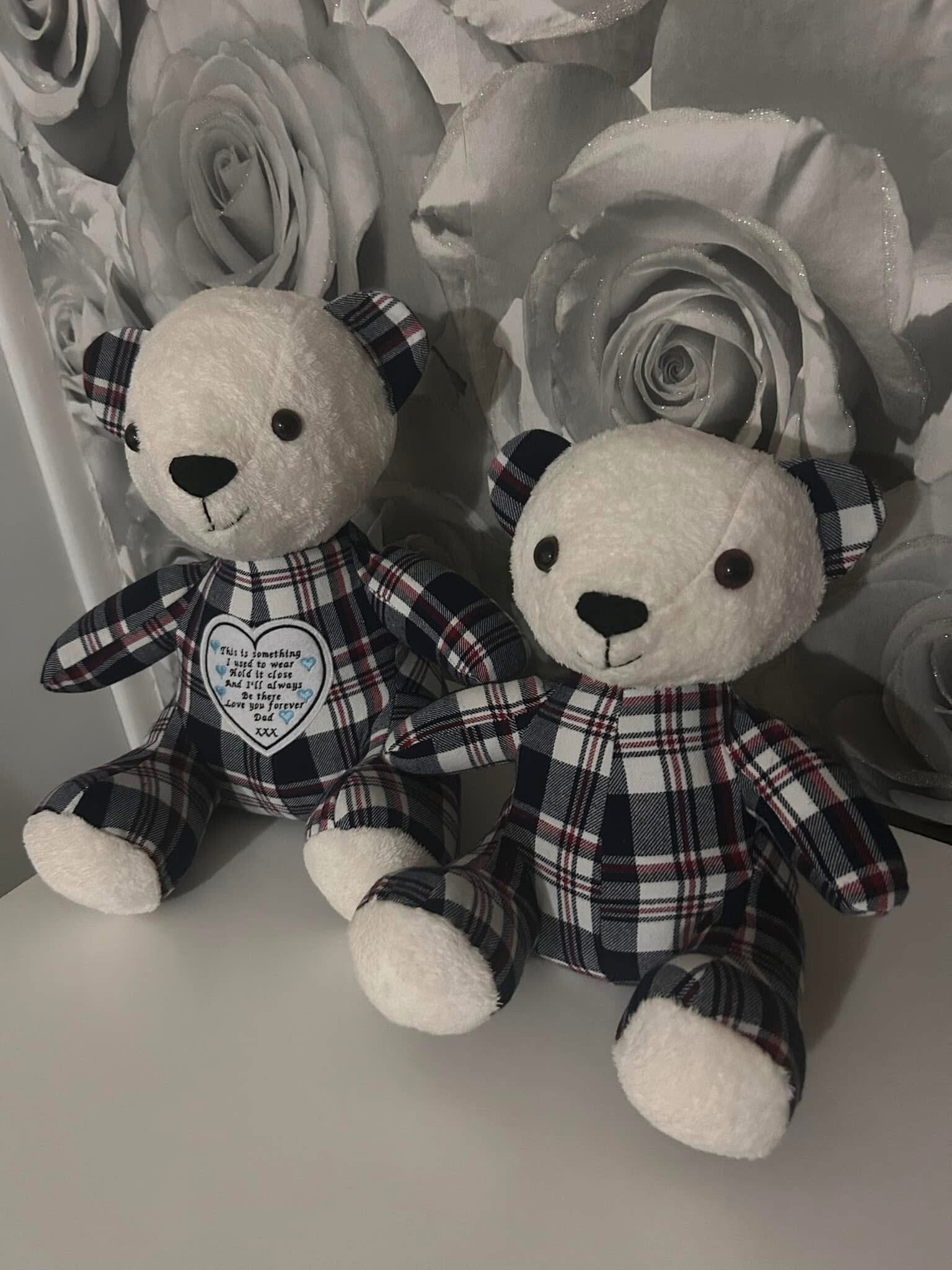 Each Memory Bear is lovingly handmade from your cherished clothing, transforming precious garments into a soft, comforting keepsake.Sitting at approximately 12 inches tall, they are the perfect size to hold, display, and treasure for years to come. Every bear is carefully created with attention to detail, ensuring that special fabrics, patterns and meaningful pieces are thoughtfully placed wherever possible.Whether made from a loved one’s clothing, baby grows, uniforms or favourite outfits, each stitch holds a story — turning memories into something you can hug.